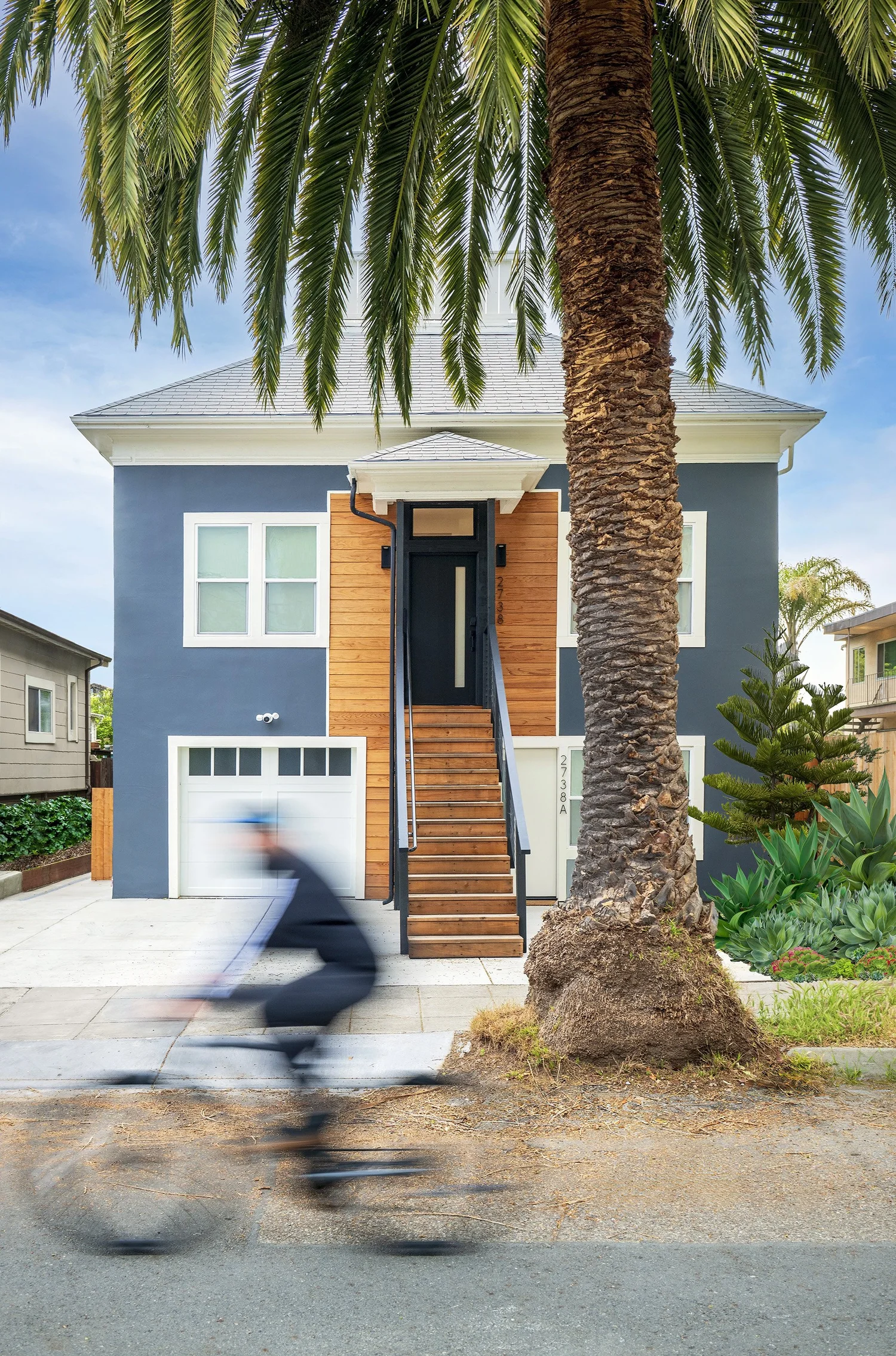 the exterior of the home is painted a deep charcoal with navy undertones and white trim. cedar siding centers the staircase and the front door. the interior palette includes clean white walls throughout, white oak flooring, cool grays in the tile and blond wood kitchen and bathroom cabinets all punctuated with matte black hardware, lighting fixtures and black steel railings. texture and color pops are brought in with the art pieces, rugs and textiles, giving the home vibrancy and warmth. the fifteen foot ceilings on the main floor give the space an open, gallery-like feel. we had fun playing with art placement, hanging pieces at various, sometimes unexpected heights.