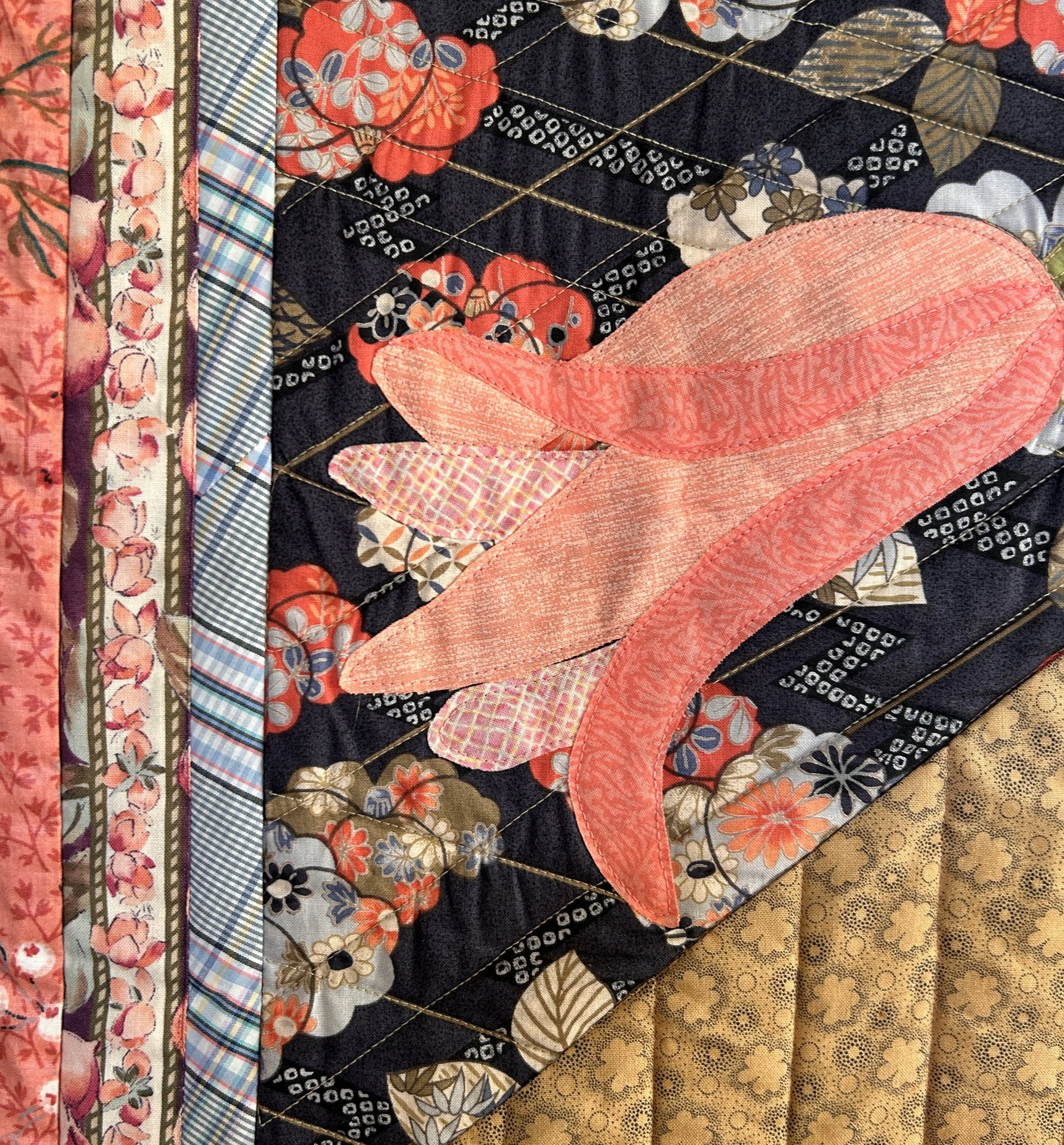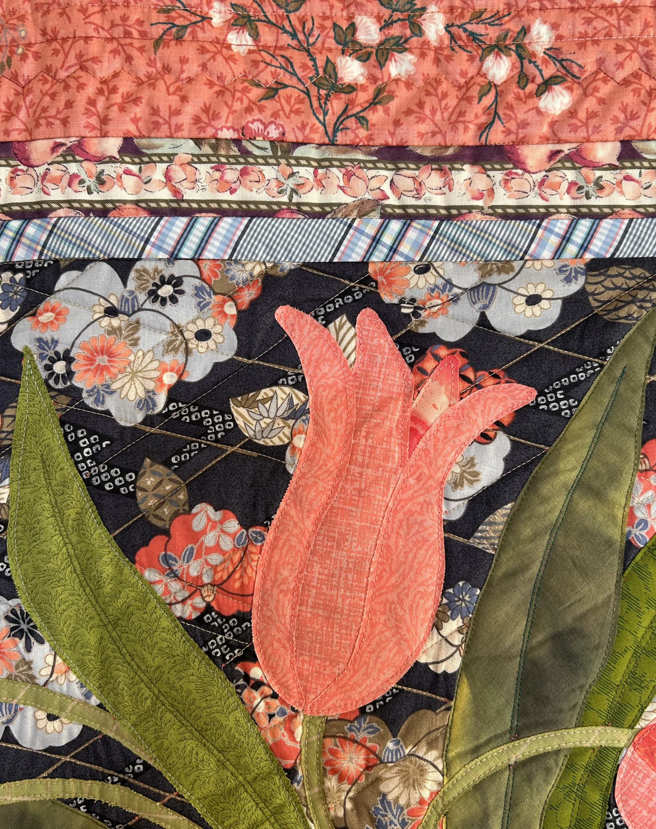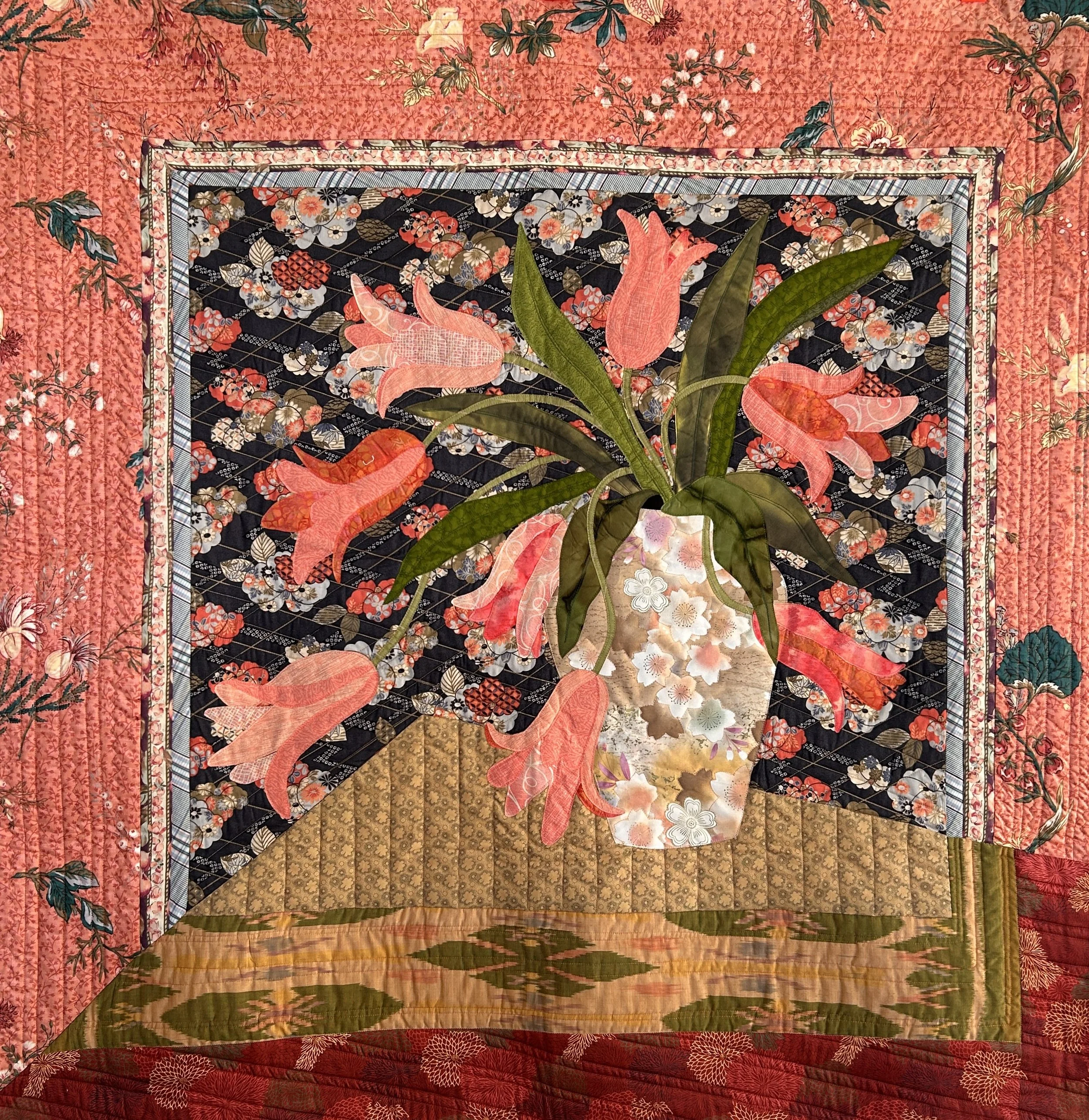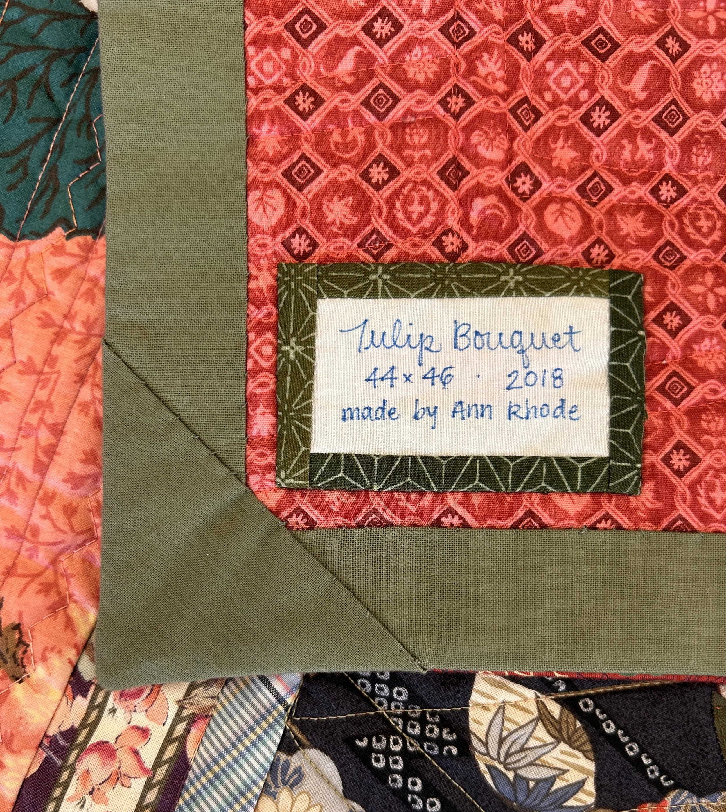 tulip bouquet is fused and machine pieced and machine quilted. fabrics and batting are all cotton.
