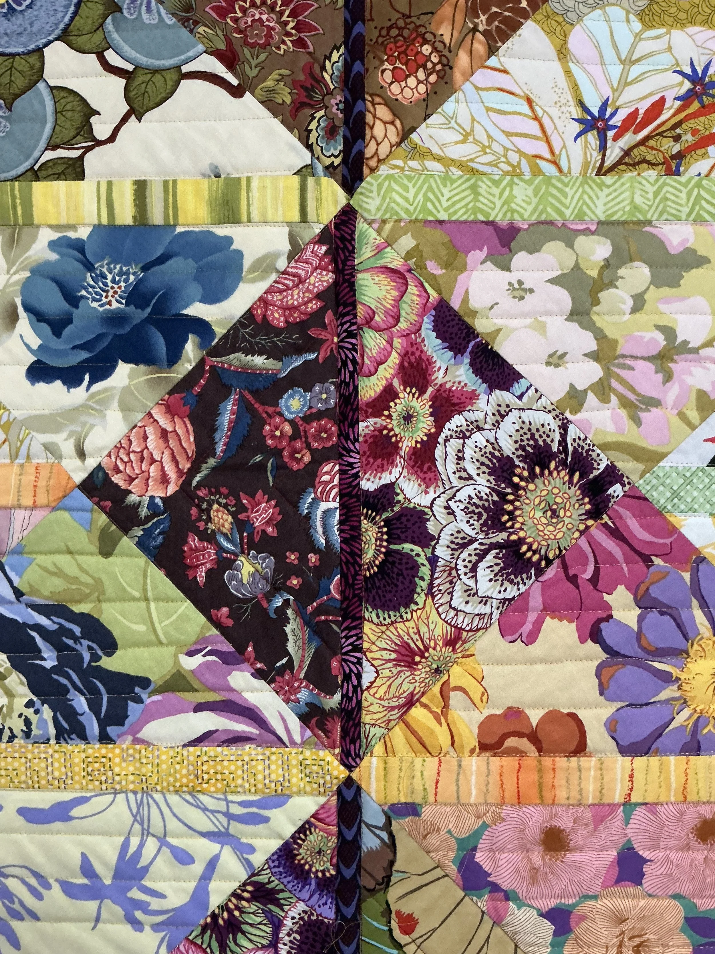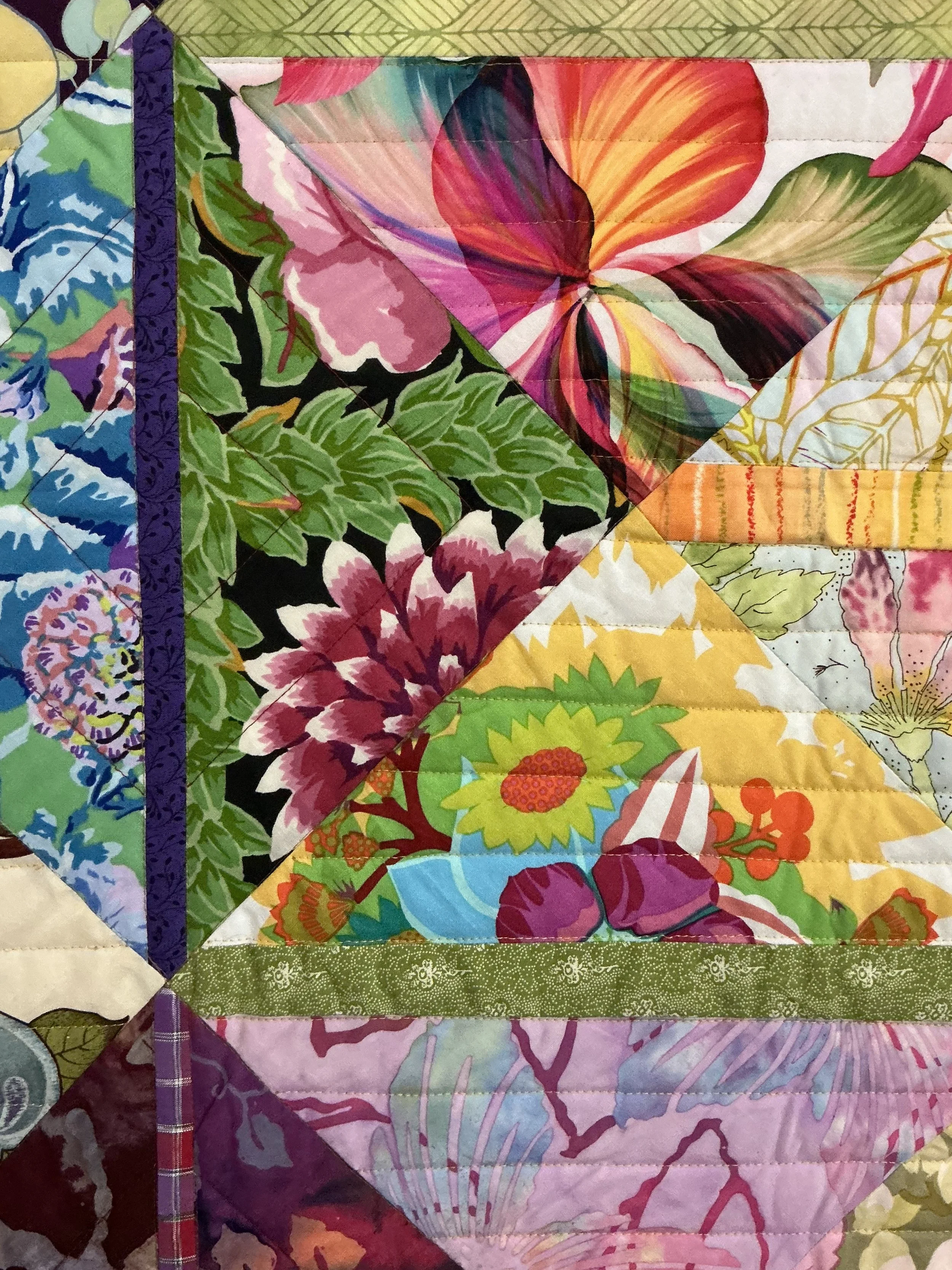 ann created “flower power” to showcase her collection of big floral prints. when designing it, she felt it needed the darker verticals with the thin strips to give some structure to the piece and to encourage the feeling of dappled light peeking through. the wider horizontal strips provide tranquil pathways across the lighter triangles.