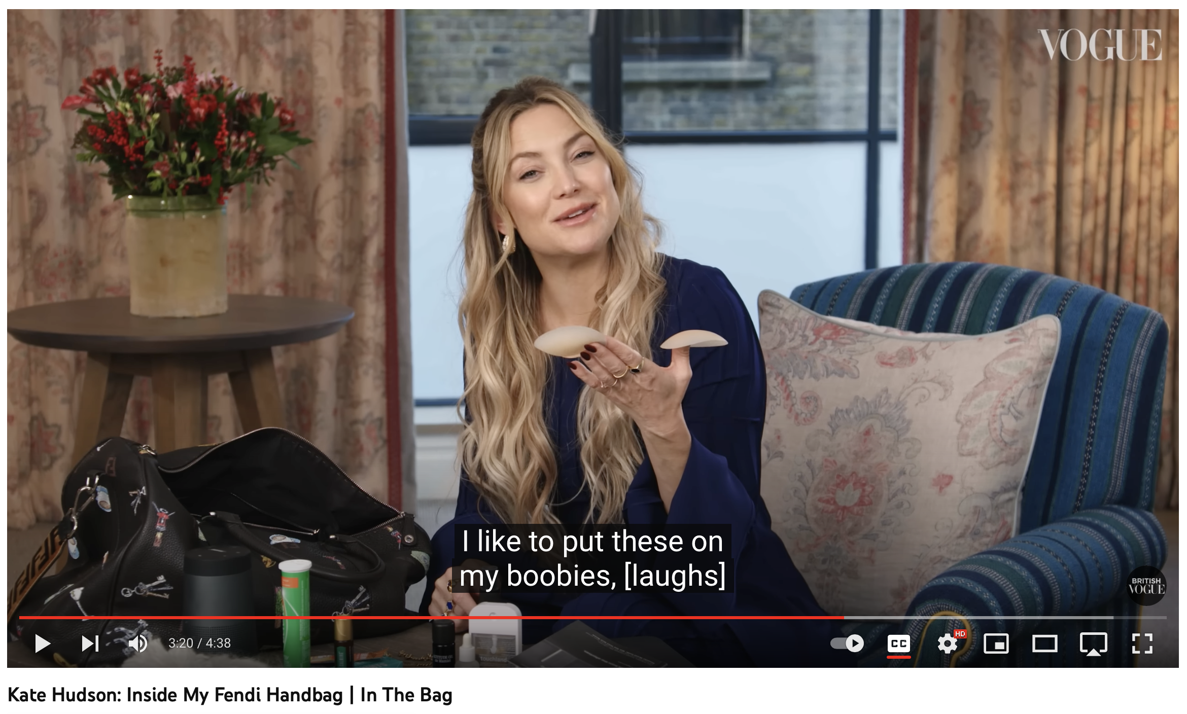 (kate being interviewed about “what’s in her bag” … she always carries BOOBIES!)