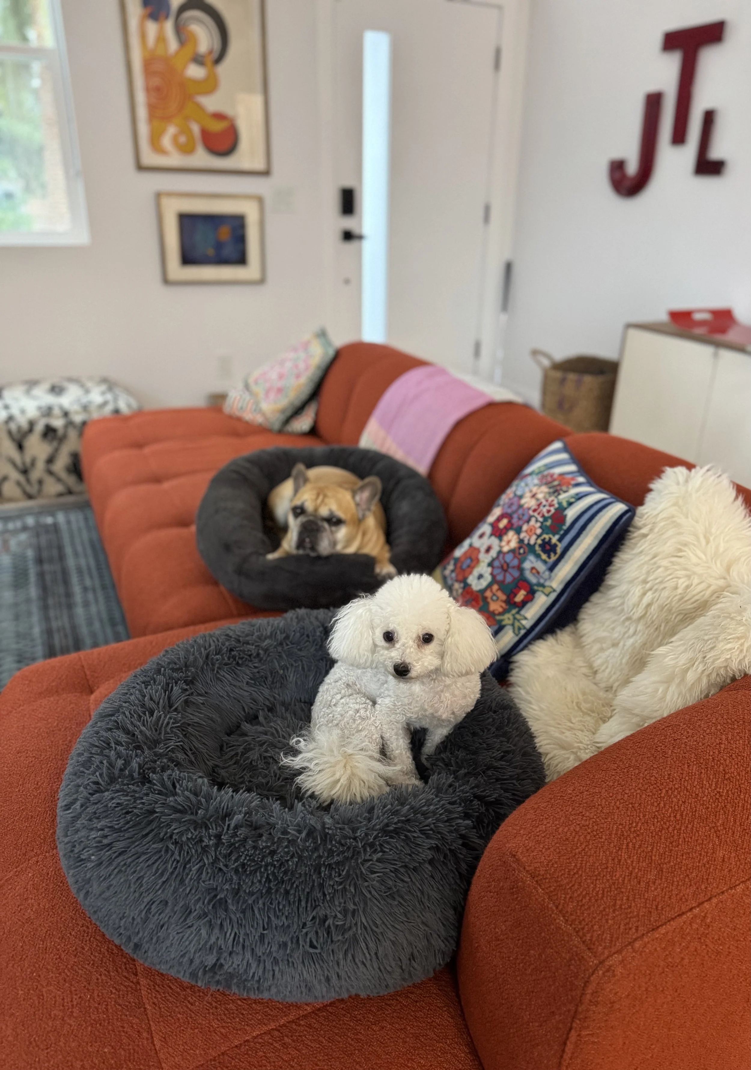 (rosie and hank have staked out their donuts on the sofa. “separate spaces” seems to be key, especially when they are eating… i had to feed rosie in my bedroom with the door closed. she is a nibbler who takes her time and hank is gobbler who finishes off a meal in about four seconds. he then tries to polish off whatever remains of hers so they were not compatible dining companions!)