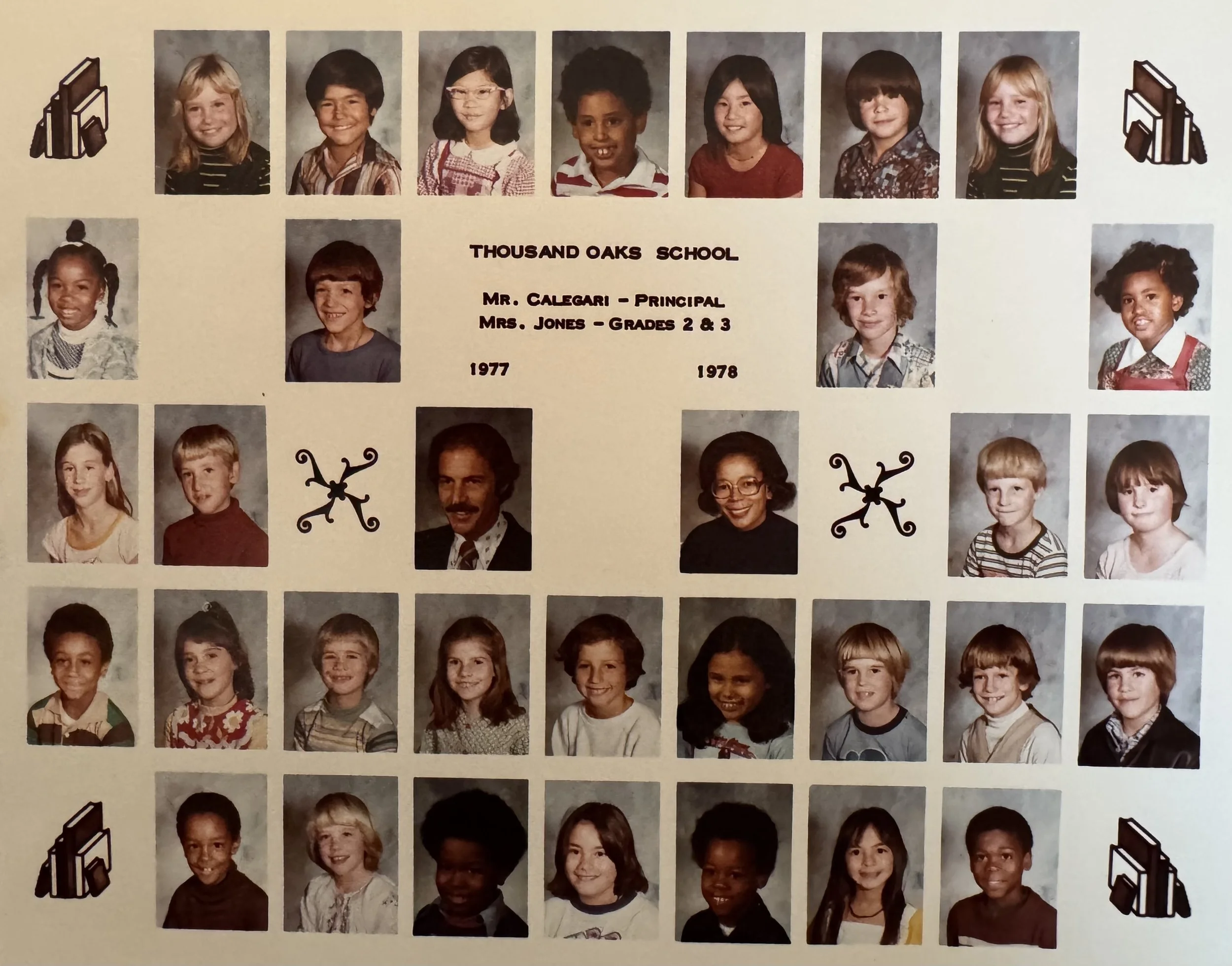 (my class picture from third grade… mrs. jones is right in the middle. to her left is mr. calegari, our handsome principal. we were all in LOVE with him [i think A LOT of the mamas had crushes too.] he would come out to the playground at lunch sporting a corduroy blazer with suede elbow patches and his tom selleck mustache and kick one of our red, rubber dodge balls so far it looked like it hit the moon. all the kids would be swooning in admiration. a side note, one of my mother’s friends actually MARRIED mr. calegari much later and it is still one of my favorite love stories!)