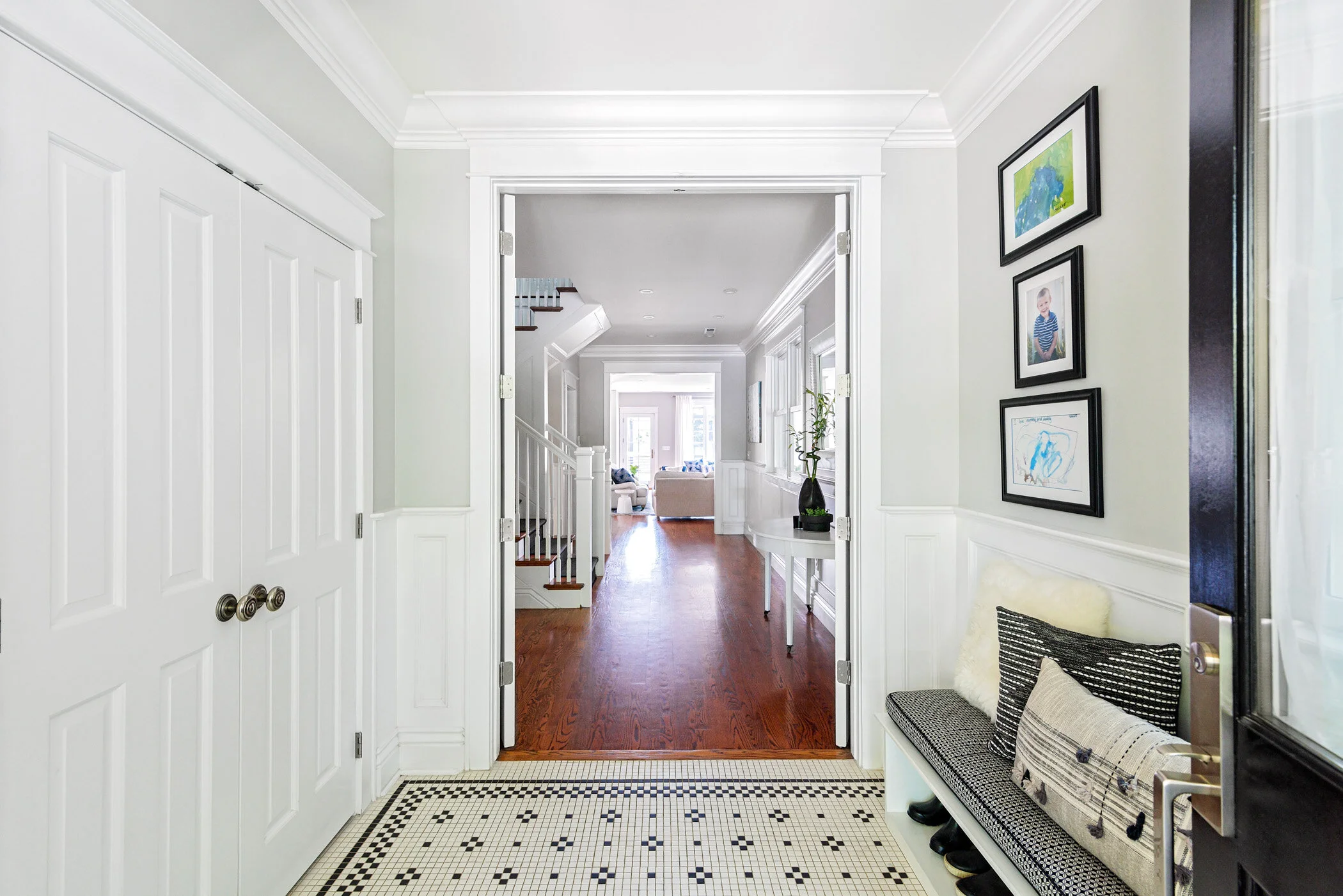 the entry has a traditional, graphic tiled floor, wainscoting and light gray walls that continue throughout the house.