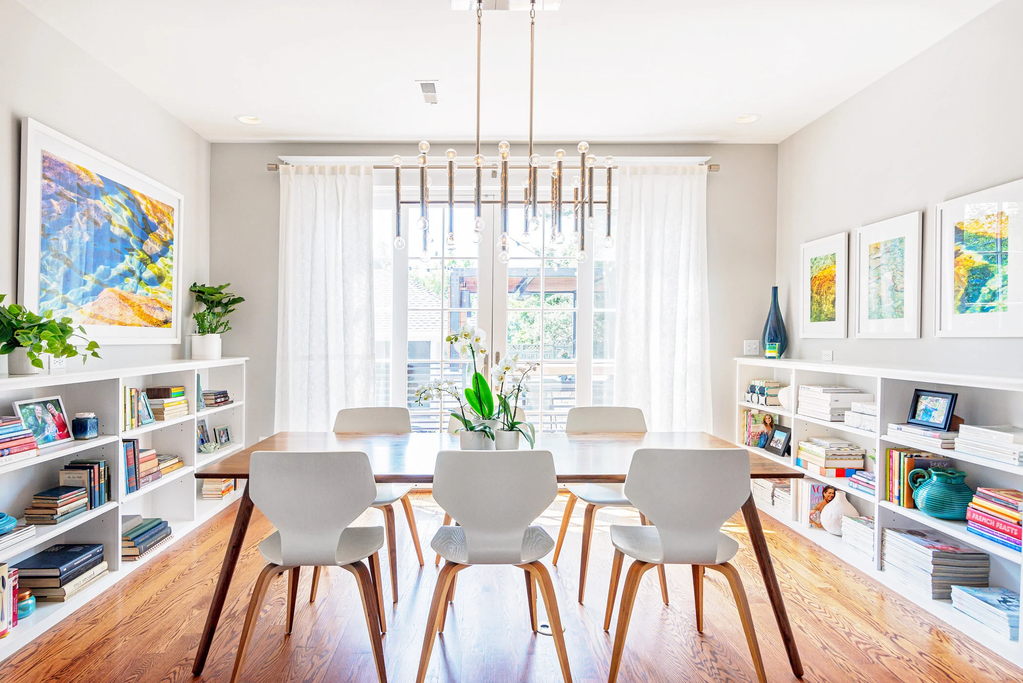 the dining room hosts a series of ocean photographs taken by the family’s grandmother that frame the pared-down, mid century table and white, bent wood dining chairs.