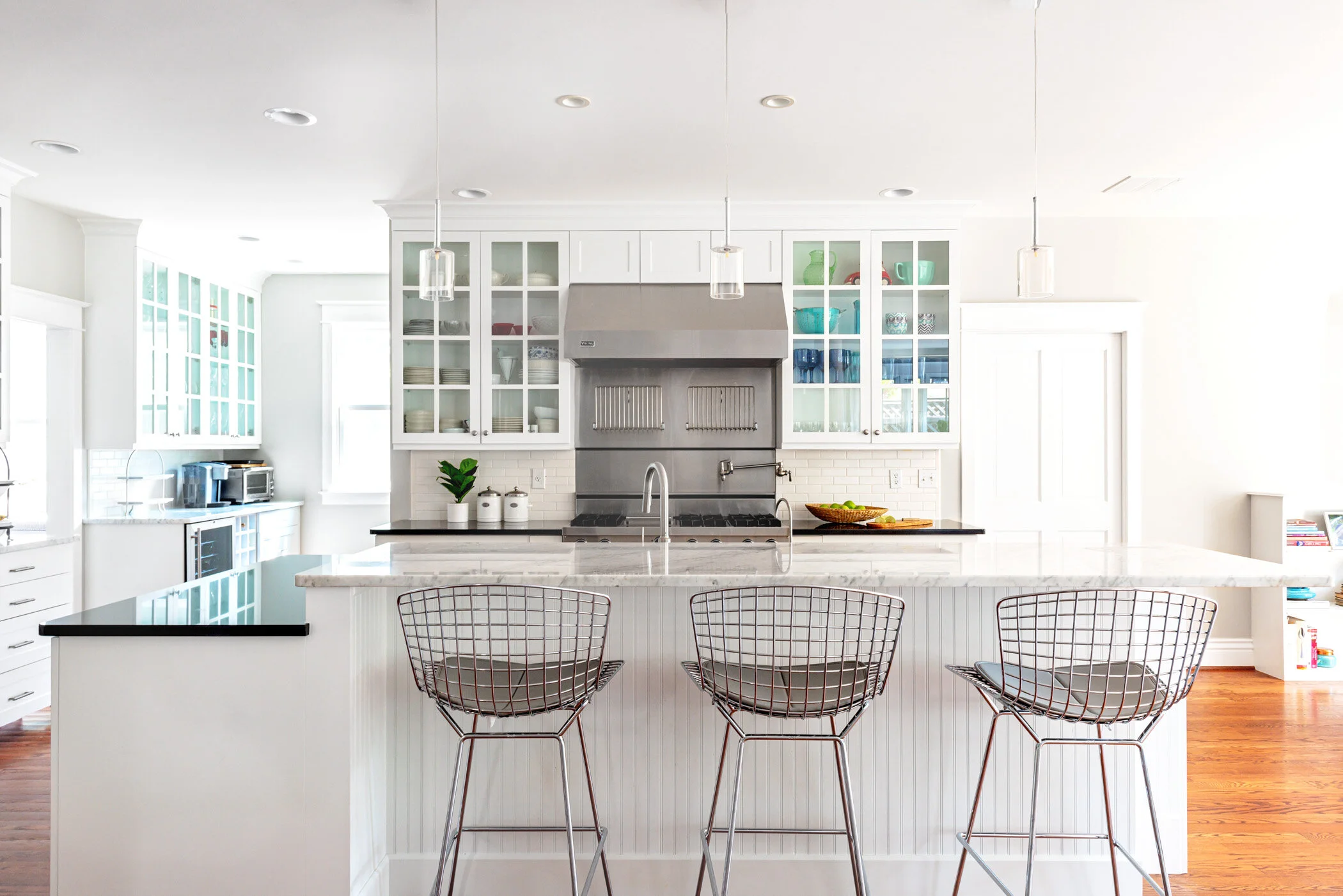 the shiny, chrome bertoia bar stools and uncomplicated, clear glass island pendants are unexpected, yet fitting additions to the traditional kitchen, creating a juxtaposition of styles and giving the kitchen more interest.