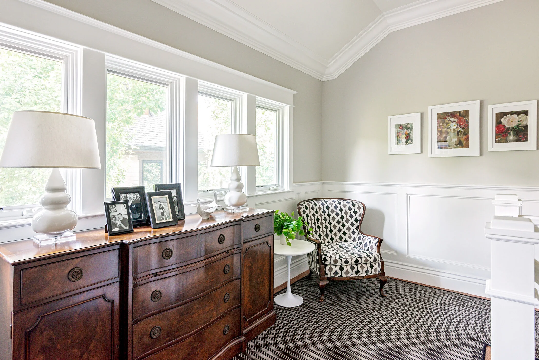 on the landing, an antique chest inherited from beloved grandparents is accessorized with circular, white table lamps and whimsical jonathan adler ceramic birds. the wood-framed, rococo side chair has been reupholstered in a fabric with a fun, mod pattern and placed with another saarinen tulip table.