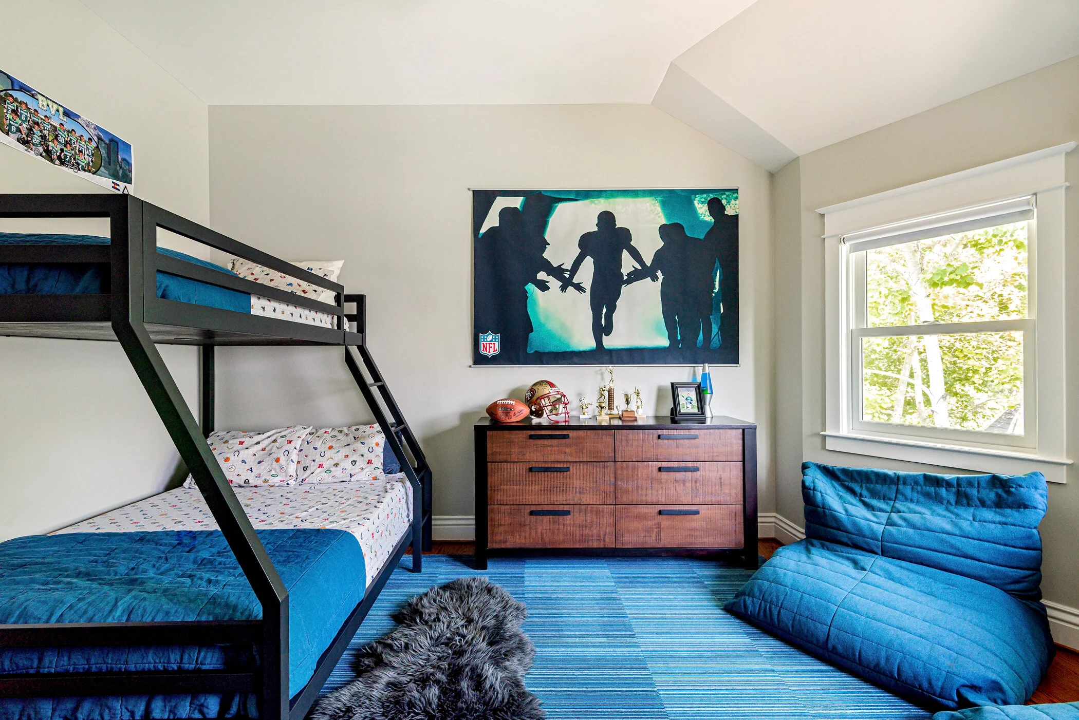 the bedroom of the middle school son is a study in blues and steel: striped flor carpet tiles, denim bean bags and bedding with a charcoal steel bunk bed and steel framed dresser.
