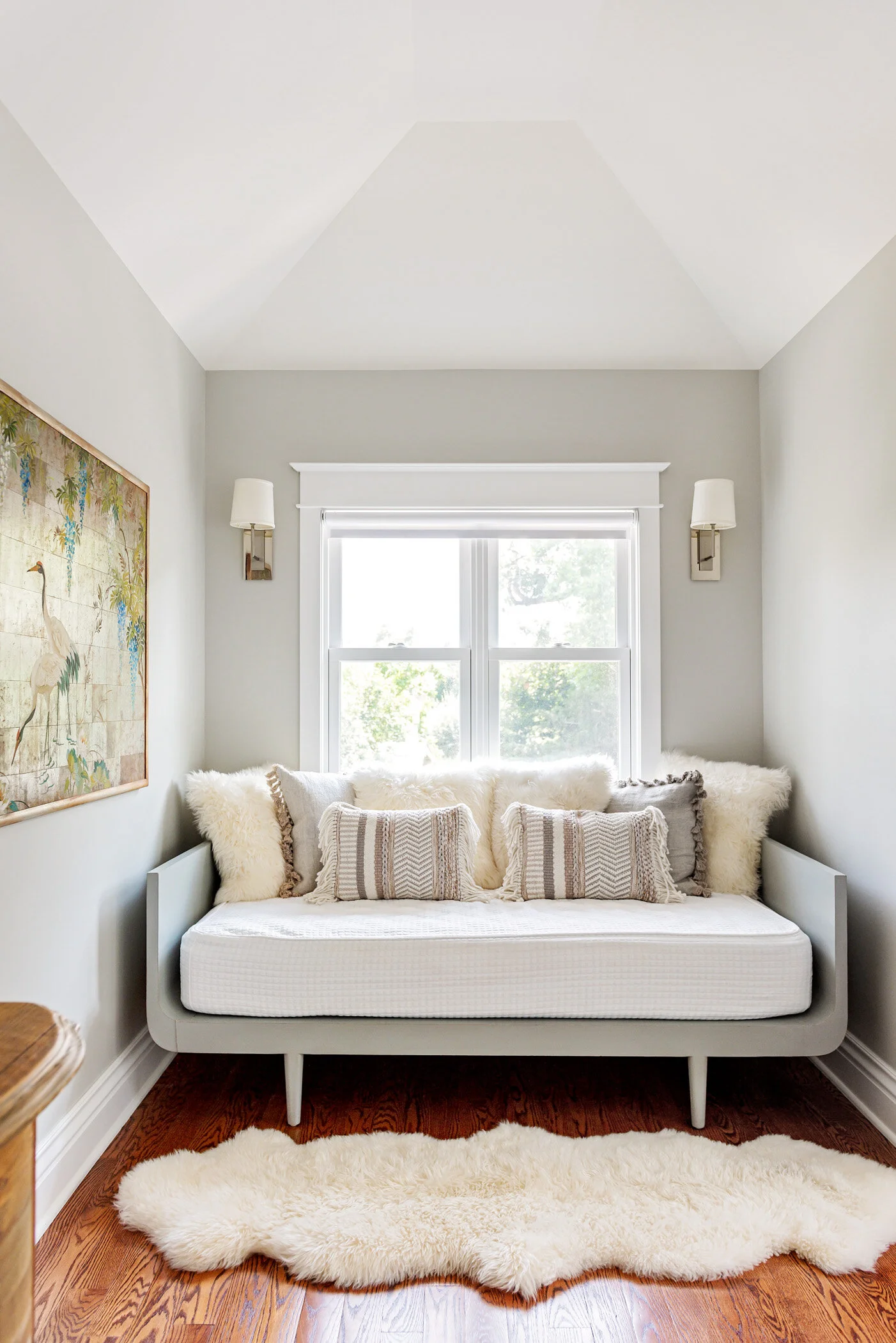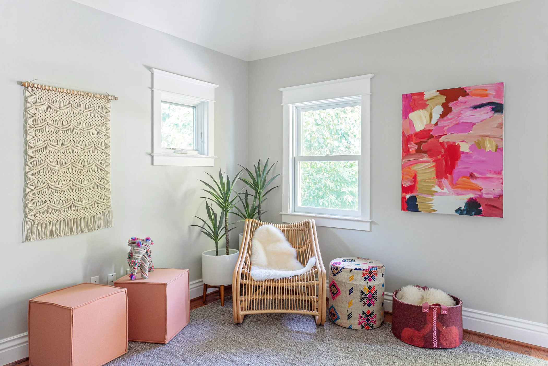 the sarah kinn abstract in the guest room sets the palette of neutrals and rose tones. the macrame hanging, felted ottomans and basket and knobby wool rug give the room texture.