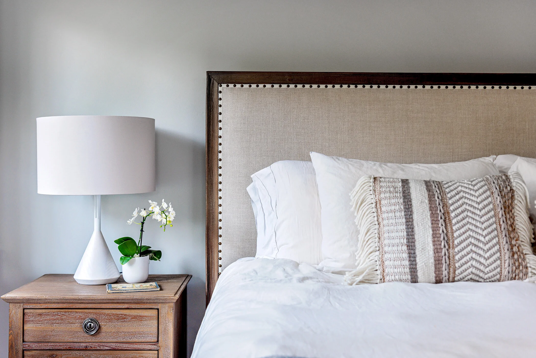 we limited the color in the master bedroom to keep the space tranquil and calm. streamlined pieces like the lounge chair and ottoman, side table, lamps and sheepskin covered bench are mixed in with the traditional upholstered bed and nightstands.
