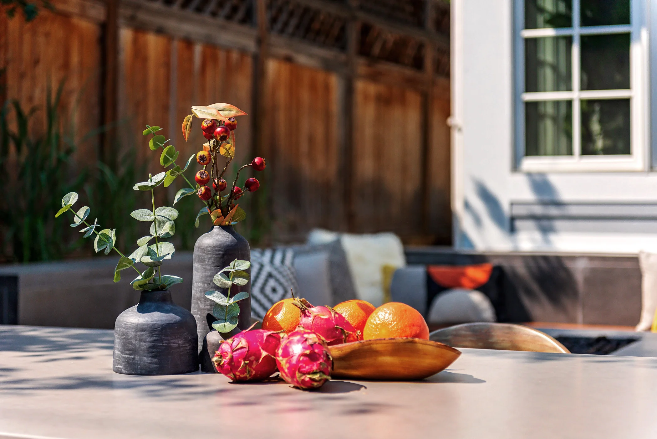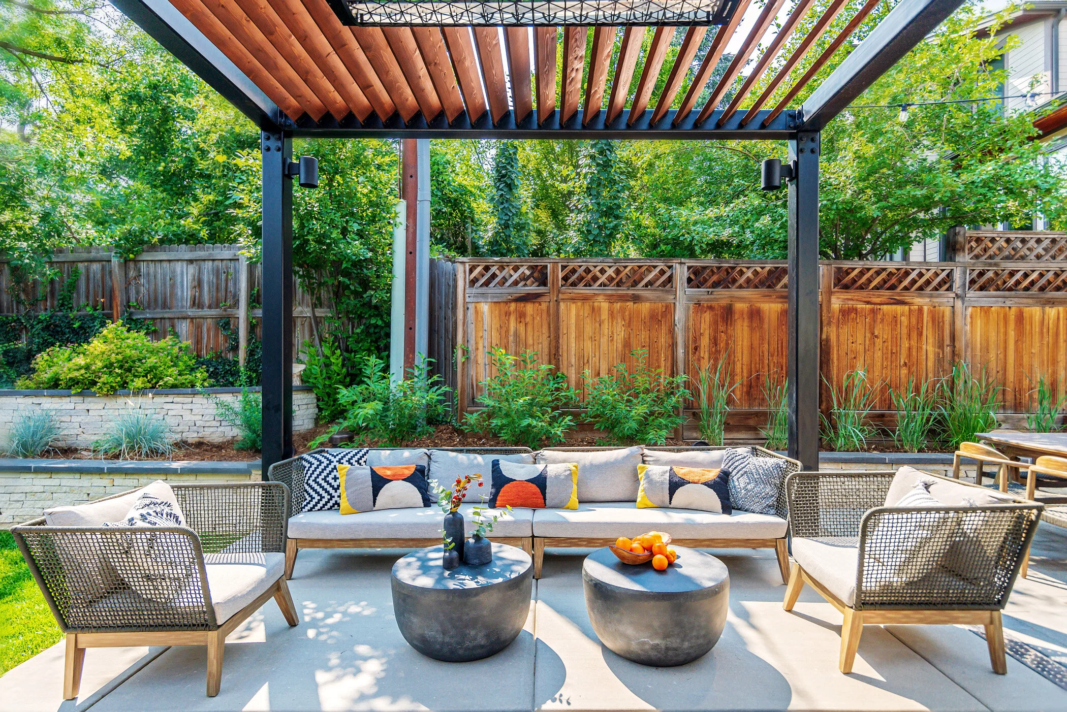 the outdoor furniture features gray cording, weathered, wood framing and tweedy gray upholstery, accented with bright, geometric pillows.