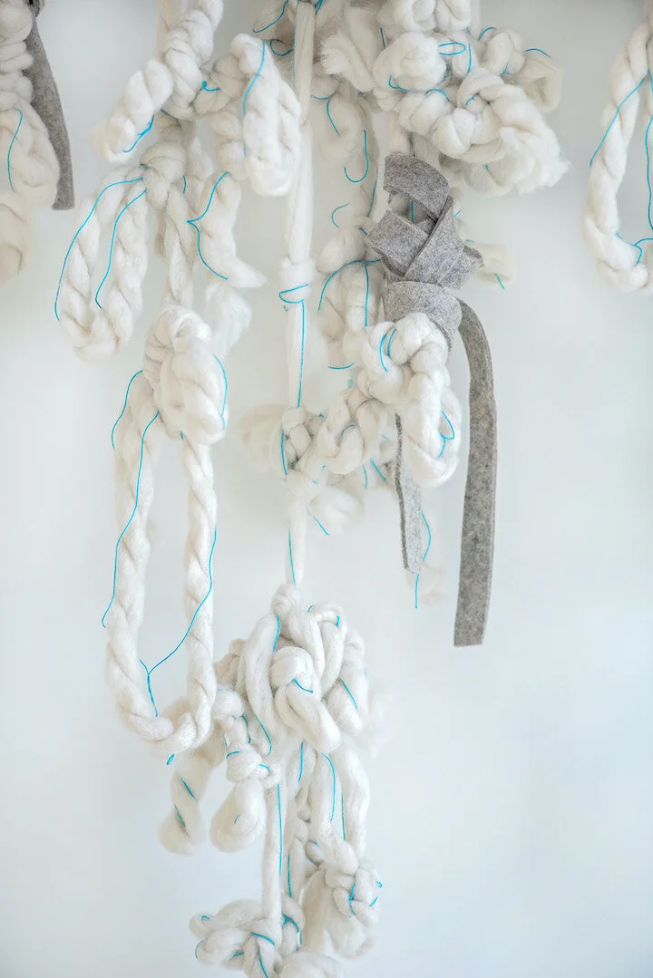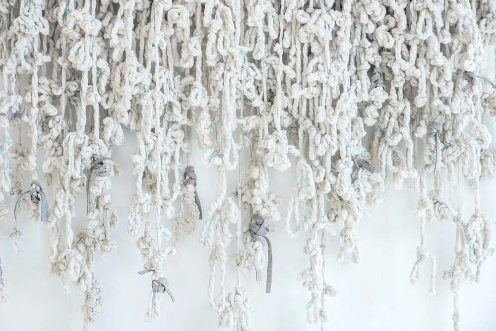 green’s process is to knot and connect fibers and threads together in a repetitive, meditative manner that gradually becomes a visual accumulation and record of the time it takes to heal. each knot begins as a distinctive moment and eventually blends into the greater experience, impossible to distinguish. as such, her work represents the intricacies of time and healing.