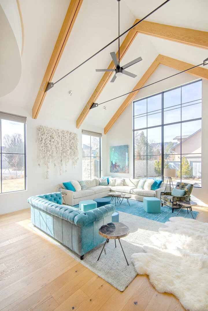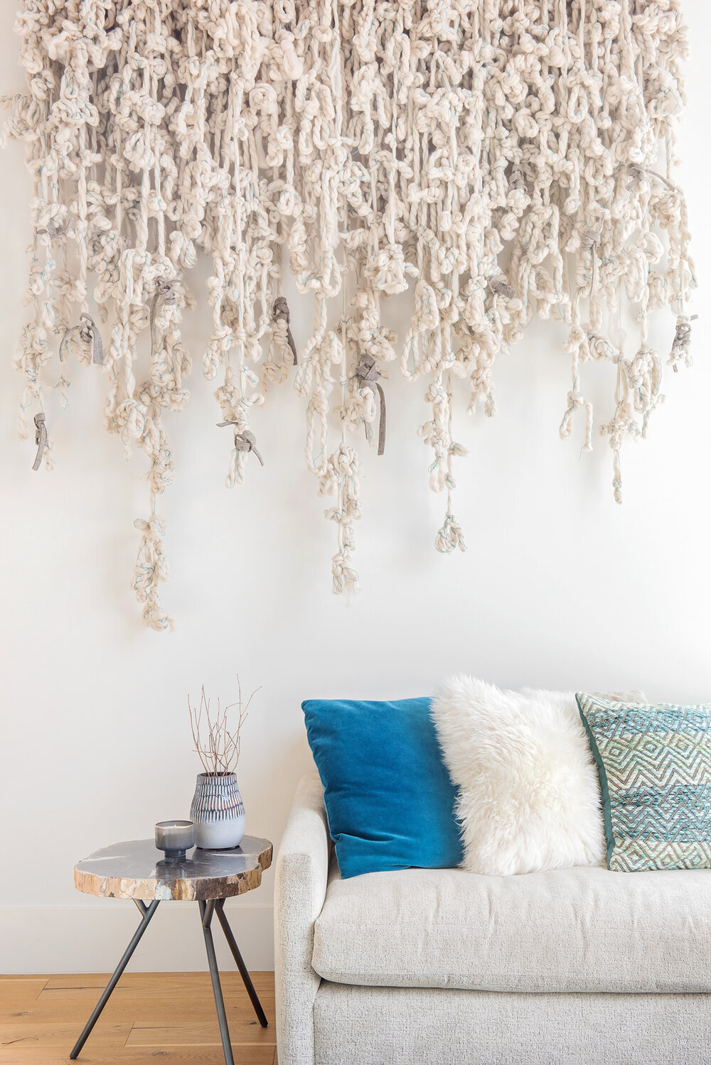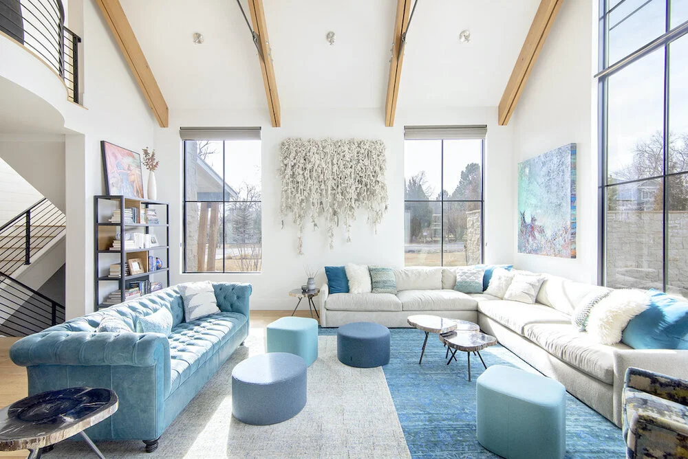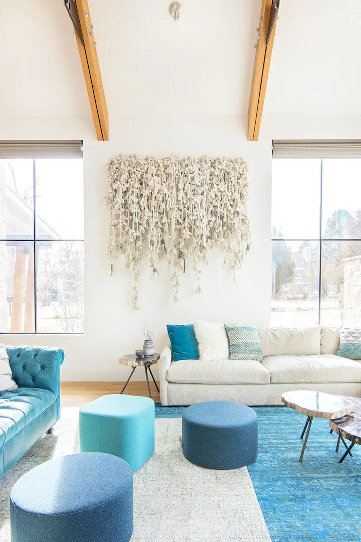 we created warmth and continuity in this bright, extensive living room by establishing a cohesive color palette of neutrals and a range of teal blues and including a variety of texture in the leather sofa, the felt ottomans, the layered rugs, sheepskins, the cozy fabric corner sofa and the textile wall piece commissioned from fiber artist, erica green.