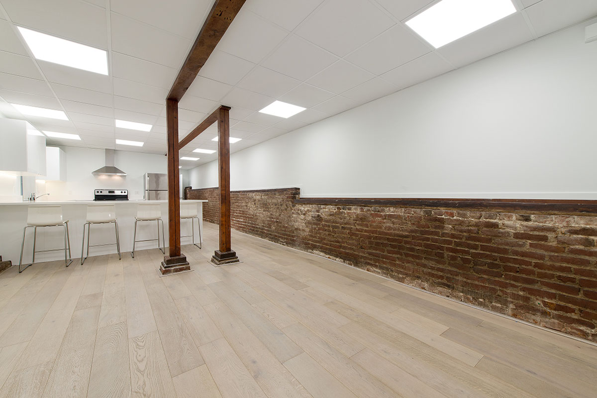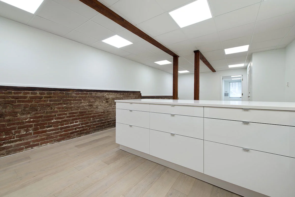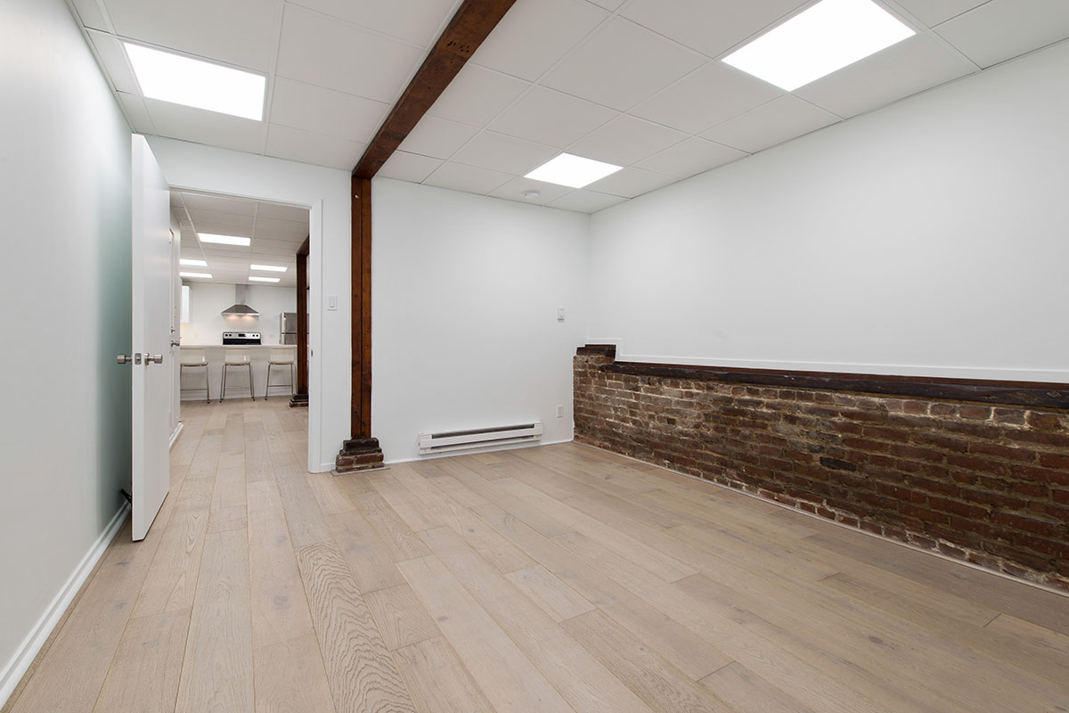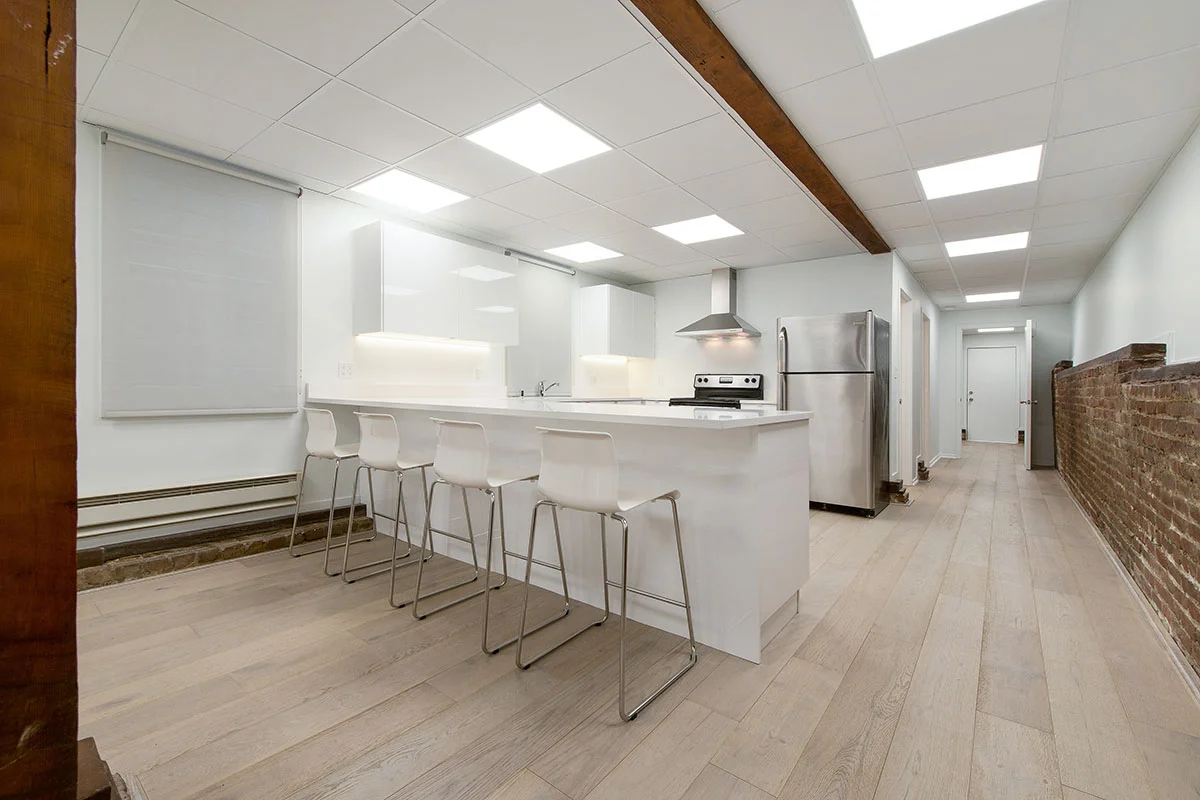 this ground floor apartment has very little natural light. i wanted to brighten the space with floods of light and clean, simple cupboards and fixtures. i love the contrast of the spare, white elements with the warm wooden flooring and natural brick and beams.